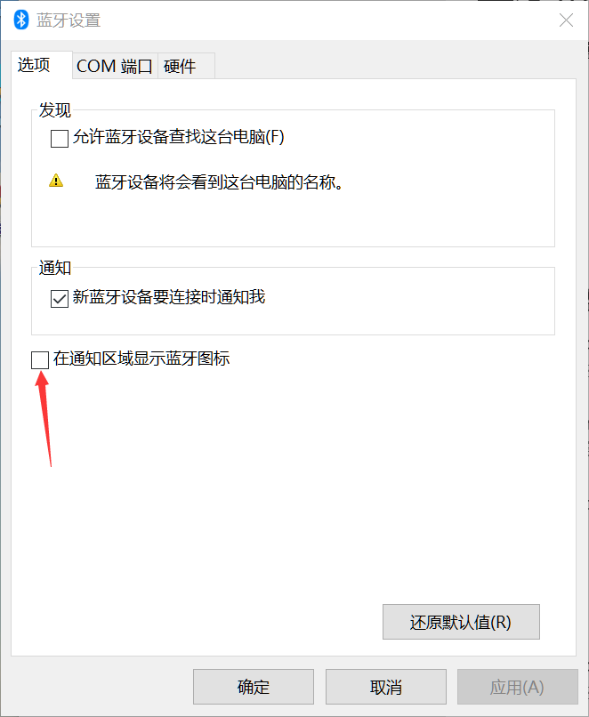 注意在通知区域显示蓝牙图标,如查原来是空的,请在方框内打勾。