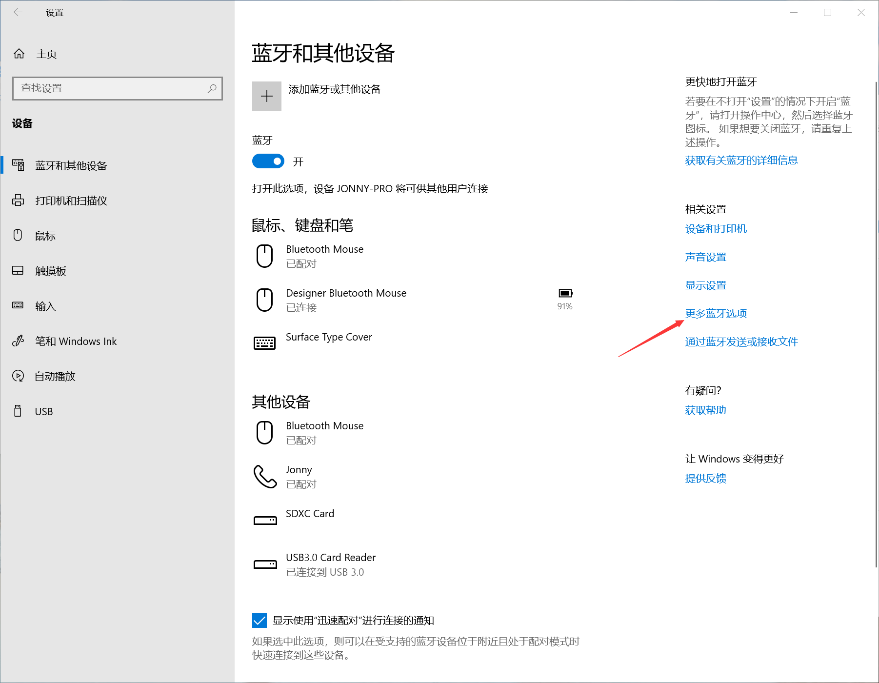 注意箭头的方向,该打勾的地方打勾。最后就会看到蓝牙回来了。
